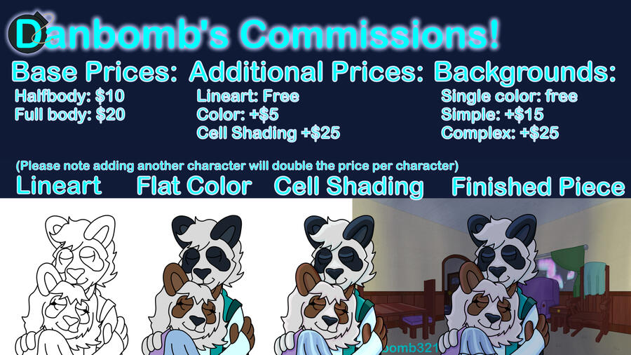 Welcome to Danbomb's Commissions Page!Here you can find all the information about getting a custom digital drawing from me.* I accept payment through PayPal and will require 50% of the total price up front.